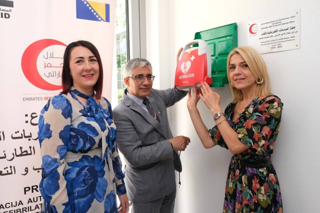 AED uređaj uručila je direktorica Zavoda za hitnu pomoć Jasna Husejinbegović-Musić, tokom kratke ceremonije kojoj je prisustvovao i ministar zdravstva KS Enis Hasanović, te generalni direktor Ureda emiratskog polumjeseca u BiH Mahmoud Aly.